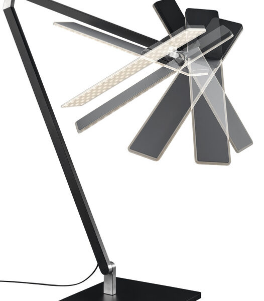 LED-Tischleuchte für den Officebereich, Diffusorfläche aus Polycarbonat mit ausgerichteten Kegelsenkungen zur Entblendung und Lichtlenkung, Leuchtenkopf und -arm aus Aluminium, Fußplatte aus Stahl.