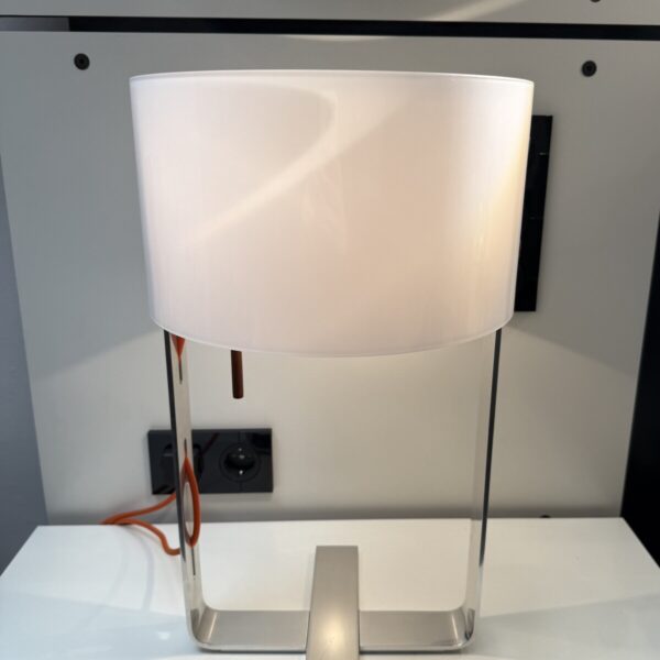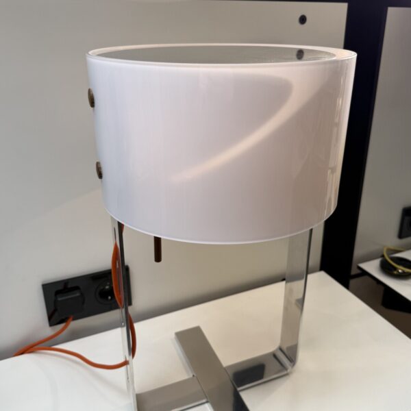 Bei der Tisch MARY wird ein mundgeblasener weißer Kristallglasschirm von einem hochglänzend poliertem Chromgestell getragen. Das farbige, stoffumwobene Kabel in orange ist durch das Gestell gewoben.