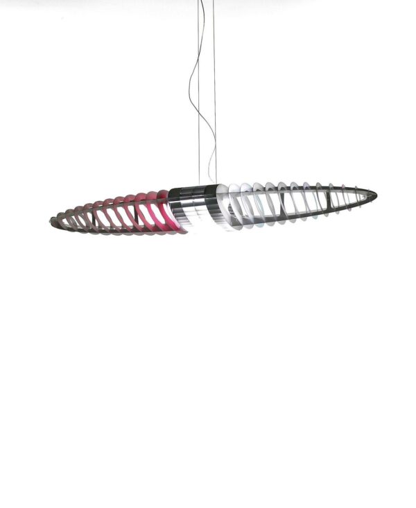Designklassiker von Luceplan. Die Pendelleuchte ist mithilfe eines Gegengewichts höhenverstellbar. Farbfilter können für ein Lichteffekt eingesetzt werden.